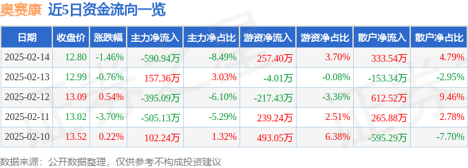 2月14日的资金流向数据方面,主力资金净流出590.94万元,占总成交额8.49%,游资资金净流入257.4万元,占总成交额3.7%,散户资金净流入333.54万元,占总成交额4.79%。